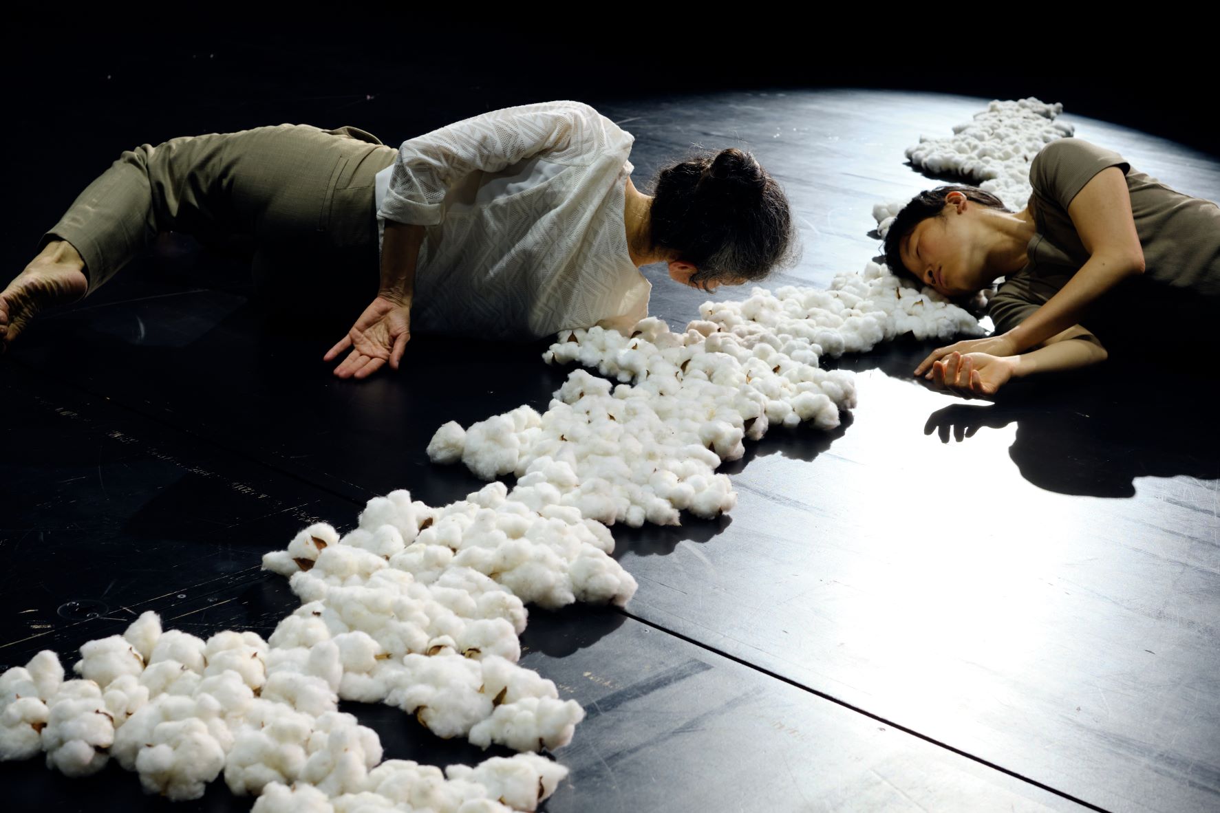 The relation of the body to the cotton was the main agency that made the embodiment of the drawings possible. In the choreographic work Cotton Flowers Exist, cotton is used as a material whose aesthetic value becomes the experience of the performance.