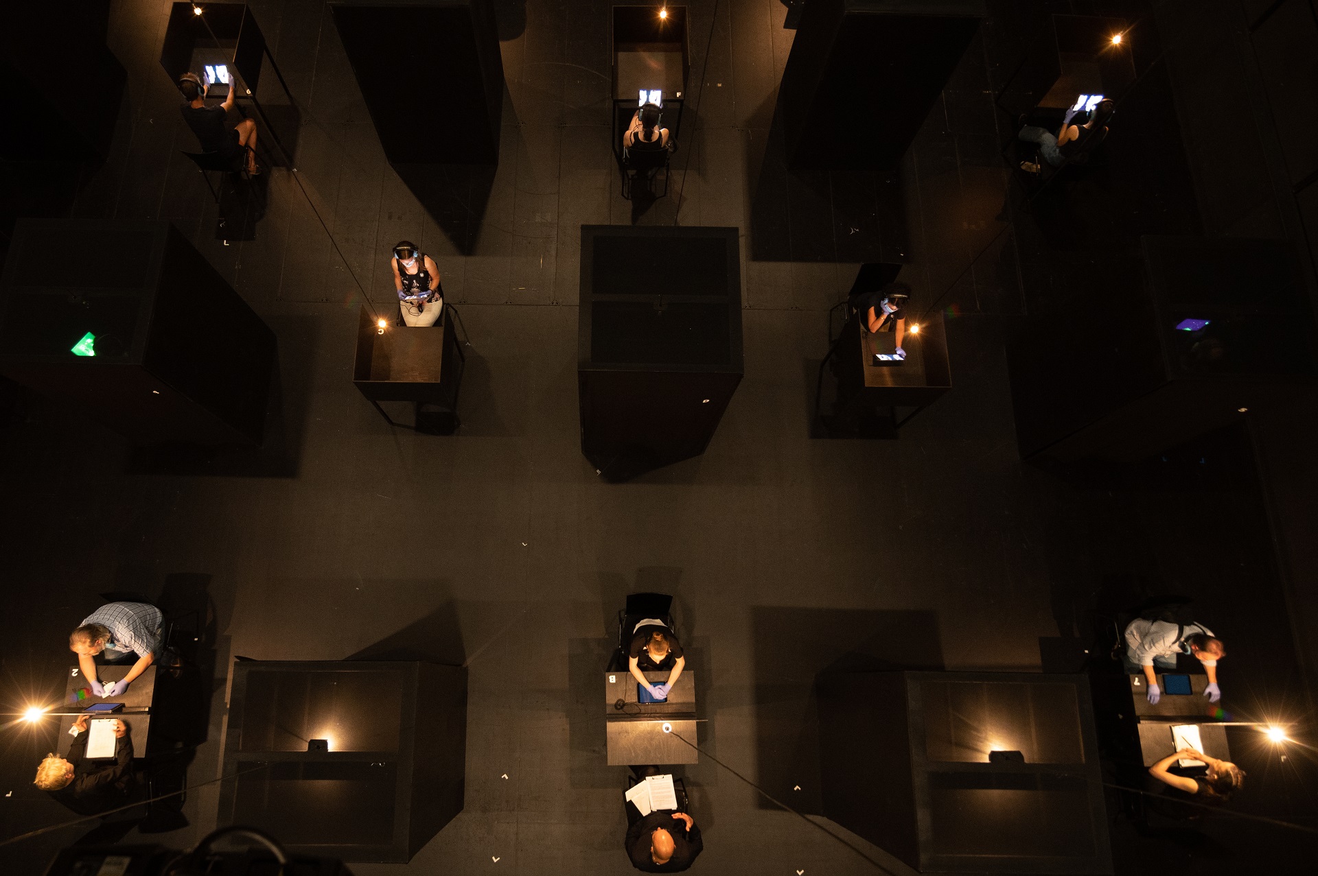 During the performance, the audience is invited to move freely through the space, guided by a tablet and headphones.